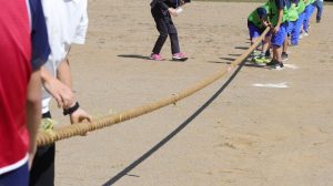 赤と青に分かれた子どもたちが綱引きに挑戦中。ピンクのシューズを履いた先生も一生懸命声をかけています。両チームとも真剣な表情で、力いっぱい引っ張る姿に思わず「がんばれ~!」と応援したくなりました。
