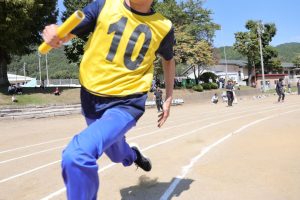 10番のゼッケンをつけた黄色いユニフォームの子が、バトンを握りしめて走っています。背景には長野の美しい山々が広がって、本当に絵になる風景。走る姿が力強くてカッコいい!