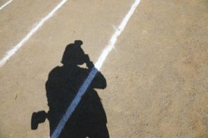 これから始まる競技に向けて準備万端です。右端にはカラフルなユニフォームを着た子たちも。静かな今このグラウンドも、もうすぐ歓声で賑わうんでしょうね。走る前の静けさって、なんだかワクワクします。